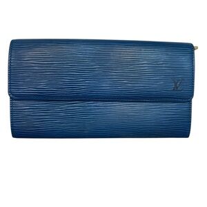 Beautiful Louis Vuitton Sarah wallet in myrtille, a unique stunning blue color. Front flap snap closure. Interior with beautiful blue leather. Excellent used condition! Minor rubbing on corner per pics. Put some color in your life, and carry this blue beauty! FYI…. Bird in background of video😂
