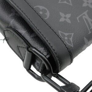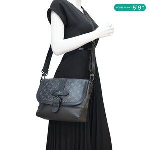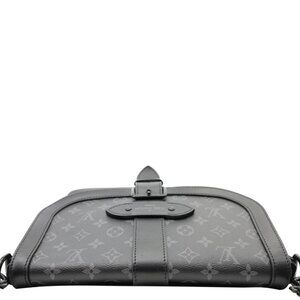 The Louis Vuitton Saumur Monogram Eclipse Canvas Messenger Bag in black features a sleek design with iconic Monogram pattern and durable canvas material. This stylish bag offers a flap closure and adjustable strap for comfortable, hands-free wear.
