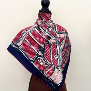 Louis Vuitton Scarf Trunks Luggage Monogram Blue Red Silk Wrap