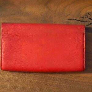 Chic Louis Vuitton wallet in striking scarlet leather. Features iconic LV logo. Perfect for elevating any outfit.