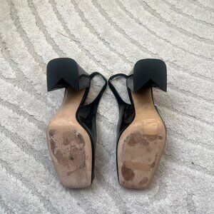 AUTHENTICITY GUARANTEED: Rarely worn, Louis Vuitton Shake Slingback Pump in Black Patent Leather! Some very light show of wear on the bottom sole of the shoe, but absolutely no scuffing on the heel. A stunning, classic black heel that makes a perfect addition to any closet!