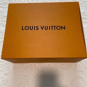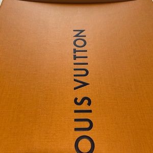 Large authentic Louis Vuitton shoe box, suitable for your LV sneakers or booties. Slightly bowed on back of top; see photos. Does not at all interfere with the usage of the shoe box. Will add two authentic LV shoe dust covers if requested.