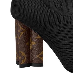 One of Louis Vuitton's most emblematic styles, the Silhouette ankle boot is revisited in black stretch textile, which provides a second-skin fit. The signature of the Silhouette line is its heel, which is shaped like a Monogram Flower and covered in patent Monogram canvas. This model features a padded insock for enhanced comfort.