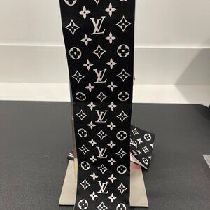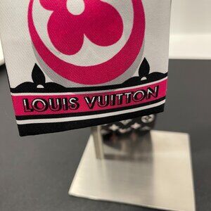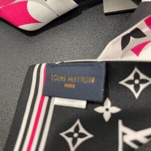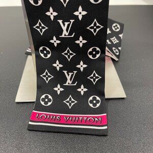 This 100% silk bandeaux features a white, black and rose background with a print of the iconic Louis Vuitton monogram. This is a preloved item in excellent condition. Take a moment to look at photos for condition. Please reach out with any questions.