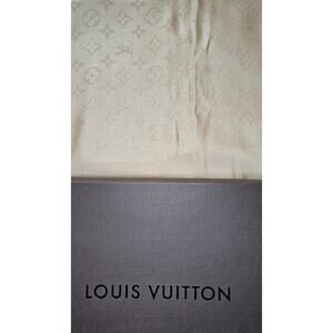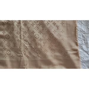 This is an authentic LOUIS VUITTON Silk Wool Monogram Shawl in tan. The Monogram pattern is the focus, with a jacquard weave to give the tone-on-tone fabric a subtle sheen. The refined silk and wool-blend fabric give the shawl an elegant drape