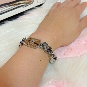 UNIQUE Elegant Louis Vuitton bracelet. Features silver chain links. Central gold-toned LV engraving on Tiger’s Eye.