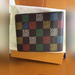 LV Vers Damier Ebene coated canvas by Pharrell Williams brings energy to the Slender Wallet’s pure lines. Primary colors are printed onto the Damier Ebene canvas, twisting the historic pattern, launched by Georges Vuitton in 1888, into something more inclusive. Eight card slots and a compartment for bills make it practical.