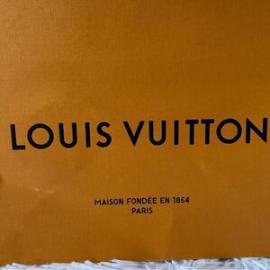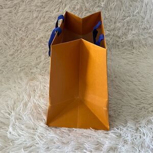 Great for staging homes or a collector of designer shopping bags! This small Louis Vuitton shopping bag is in great condition and will ship to you flat to keep structural integrity. The bag measures 8.25” high, 10” long, and about 6” wide. Orange paper is medium weight and features blue font and matching blue ribbon handles.