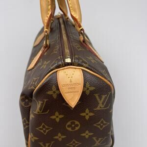 The Louis Vuitton Speedy Duffle Monogram 25 Brown Canvas Boston Bag is a stylish and luxurious handbag perfect for women. Made with durable canvas exterior and a fabric lining, this rectangular-shaped bag features a classic monogram pattern in brown. The gold hardware adds a touch of elegance, while the zip closure ensures secure storage for your essentials. With a top handle for easy carrying and a unique duffle style design, this Louis Vuitton bag is a standout accessory for any fashion-forward woman.
