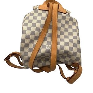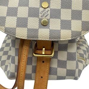 This is the authentic LOUIS VUITTON Damier Azur Sperone BB Backpack. This refined backpack is crafted of damier checkered canvas. The backpack features adjustable vachetta shoulder straps, top handle, and cinch cord. The bag also features brass hardware, an exterior zip pocket, and a crossover flap with a belt closure. The top opens to a microfiber interior with a flat pocket.