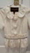 Ivory short-sleeve jacket with architectural seaming details, oversize raffia buttons, and waist that features paperbag- ruffle and four rows of sequins that alternate between white and silver. Silk lining.