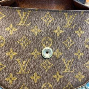 This stylish shoulder bag is crafted of Louis Vuitton's signature coated canvas. The shoulder bag features a rear patch pocket, a looping long shoulder strap with a shoulder pad and a front flap secured with a brass buckle. This opens to a compact brown cross-grain leather interior with a zipper pocket. Is a vintage crossbody, and does have some signs of wear.