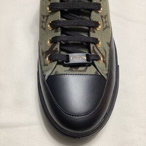 Never worn ( I’m original owner) these Louis Vuitton Stellar sneakers are in excellent condition. The Stellar sneaker is reinterpreted in Kahki-green canvas printed with the iconic monogram pattern ( monogram pattern is in a dark brown ) Black calf leather trim , a toe cap in leather and outsole complement this design which features refined details , such as gold-tone eyelets and a Louis Vuitton lace accessory. The house signature is embossed in gold on the spoiler . This shoe is very tight because it has never been worn. Come with original box and, extra set of black laces and two dust bags. Please look at all pics