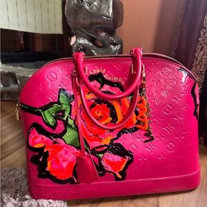 This Louis Vuitton satchel showcases a vibrant pink hue, crafted in a structured design that exudes elegance. The bag features a unique artistic overlay, transforming it into a contemporary statement piece. Its glossy finish and structured handles add a touch of sophistication to any ensemble.