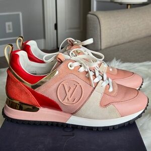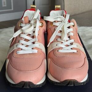 Step into luxury with these authentic Louis Vuitton run away sneakers. Featuring a gorgeous mix of blush pink, red, and white tones with luxe materials including suede, mesh, and smooth calfskin leather. Gold-tone accents at the heel add a touch of glam, while the LV logo on the side offers iconic designer flair.