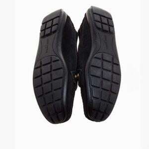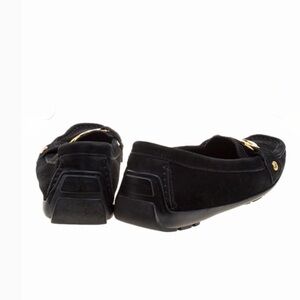 Elevate your wardrobe with these luxurious Louis Vuitton Suede Driving Loafers. These flats feature a striking gold flower monogram buckle and gold rivets for a touch of elegance.