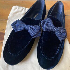 Never been worn - perfect condition! Comes with dust bag. Gorgeous dark navy suede with stylish bow. Comfortable and luxuriant.