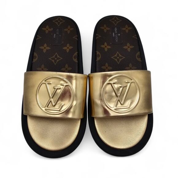 Louis Vuitton Sunbath slides, LV gold slide sandals, Louis Vuitton flat sandals, designer slides size 38, women’s LV monogram sandals, authentic Louis Vuitton shoes, luxury resort slides, Louis Vuitton metallic gold sandals, Louis Vuitton pool slides, Louis Vuitton slip-on flats, pre-owned LV sandals, Louis Vuitton logo slides, Louis Vuitton summer sandals, women’s gold monogram slides, LV vacation sandals