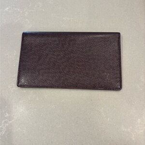 Dark purple is the color. In nice condition! Has a little tear as shown in picture and very little peeling inside. Can be used as. Check book as well! Leather is in very nice condition.