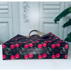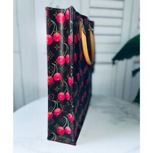 Authentic LOUIS VUITTON Monogram Cerises Sac Plat. This handbag is crafted with monogram-coated canvas overlaid with Murakami's cherry print and complemented by Vachetta leather trim and handles. It opens to a red textile lining with patch pockets. Dimensions: 14 x 3 x 15 inches