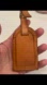 Neutral vachetta Louis Vuitton luggage tag with brass buckle closure and brand stamp at face