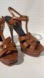 Stylish Louis Vuitton platform heels. Elegant tan leather with adjustable straps. Perfect for any occasion.