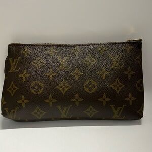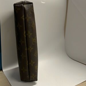 This is a beautiful and rare Louis Vuitton The French Company Zip Clutch Pouch 7.75” x 4.75” x 1.5”. There is a small crack to the monogram outer but is almost unnoticeable and does not interfere with the opening or closing. Zipper works perfectly. Authenticity tag is present. No odors.