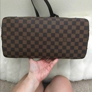 I guarantee this is an authentic LOUIS VUITTON Damier Ebene Hampstead GM or 100%. This is the largest of the Hampstead bags in the GM size. It is made of the classy damier canvas with dark chocolate smooth leather trim and handles. The bag snaps on both sides at the top to make it more compact or larger. This features a gorgeous red alcantara lining with two large zipper pockets on both sides and an additional patch and cell pocket on one side as well.