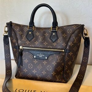 Beautiful Louis Vuitton Tournelle PM Bag! Gorgeous in black and brown with monogram print. Features a long 19"strap half black/ half BROWN monogram print, gold tone hardware, front exterior slip pocket , 2 interior slip pockets, zip closure and protective feet at base. Size: 10" bottom/13" top x 9.25" x 6". MADE In FRANCE (Date Code: MB5107). This bag is in excellent clean condition, almost looks brand new! Includes a Louis Vuitton dust bag! Thank you.