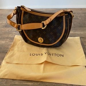 The discontinued and no longer made Louis Vuitton Monogram Canvas Tulum PM Bag makes a perfect everyday bag. Named after the Mayan City in Mexico, the Tulum PM features a chic hobo design with a unique turn lock clasp and elegantly rounded lines and pleated details. The cowhide shoulder strap features an embossed Louis Vuitton logo and metal link details . This will be your new favorite bag! comes with a dustbag. This item has been used and has some signs of light wear.