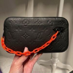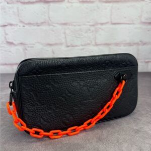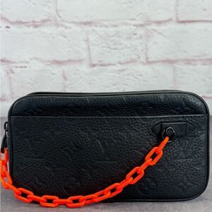Embossed leather with orange chain. Front slip pocket and zip entry to main interior.