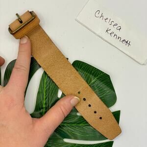 Louis Vuitton Vachetta leather strap holder cuff / bracelet. Intended to be strap holder, but can be worn as cuff on TINY wrists, or kid’s wrists. Roughly 8' total; last hole is 6''. WRIST NEEDS to be 6in OR LESS CIRCUMFERENCE TO FIT. Good for a child!