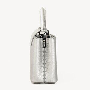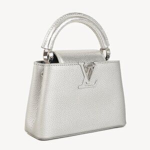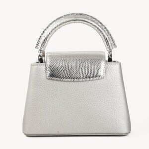 Expertly crafted from the finest materials, the Louis Vuitton Varanus Salvator Lizard Flower Chain Capucines Mini Silver is an exquisite statement piece. With a metallic calfskin and lizard leather design, it features a reinforced top handle, detachable silver-toned shoulder strap bearing Vuitton's iconic monogram flowers, silver-toned metal feet, and a prominent LV logo in centre for the most opulent touch.