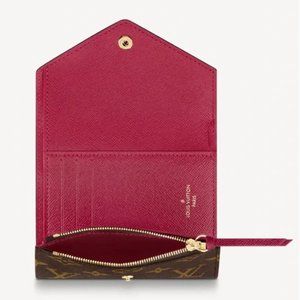 The compact Victorine wallet in Monogram canvas with rare fushia interior combines femininity and functionality. It opens out to reveal many practical features, including card slots and pockets for bills and coins. Its envelope-style flap is sealed with a gold press-stud.
