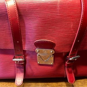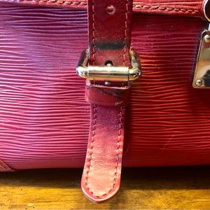 Beautiful vintage Louis Vuitton Beverly bag in red epi leather. It has some scratches on the leather and some wear to the corners. Some dark marks around the handles and on the inside. Overall still in fair condition. This bag was made in 2005.
