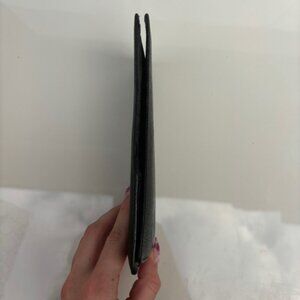 Description: black canvas outside with the logo stamped on the bottom right corner on the front, with same black canvas interior, bifold with six credit card slots on the right flap and three additional compartments for bills plus one pocket.