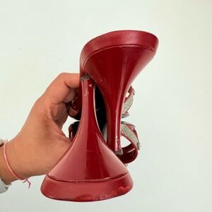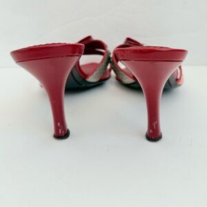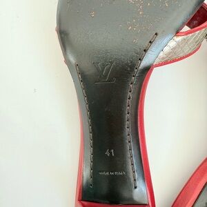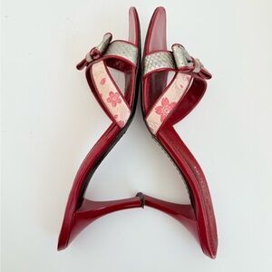This Louis Vuitton Takashi Murakami Monogram Cherry Blossom Mule Sandal Slide Snake is a stylish and sophisticated high heel sandal featuring a unique design with studded accents and a bow detail. The open toe sandal has a slip-on closure and a stiletto heel, making it perfect for parties, work, or business occasions. The sandal is crafted from leather, snake skin, and fabric with a red and silver color combination, adding a touch of luxury and elegance. Ideal for the modern and professional woman looking for a designer shoe with a vintage flair.