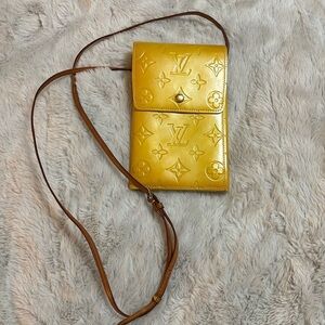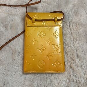 Yellow Vernis Walker crossbody bag. Basically a wallet on a chain. This little cutie looks great from the outside with minimal color fading. The inside has some paint chips. It transferred to the bag, I was able to get it off of the vernis. The little coin pocket is going to start peeling but it hasn’t yet.