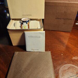This is an authentic rare Louis Vuitton Watch Q121V Tambour edition, 26mm face, Women's, with a Pink Mother of Pearl watch face, and a white Multi Color band really beautiful. A great collector's piece for any Louis Vuitton lover. This beautiful Louis Vuitton watch is lightly used and well taken care of. Includes dust rag, full directions and another set of directions inside the original Louis Vuitton box, manual, signed and stamped warranty card purchased November 6, 2004, and certificate of authenticity.