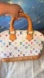 This Louis Vuitton satchel showcases a striking white canvas adorned with the iconic multicolor monogram pattern. Its structured dome shape and tan leather trim offer a timeless elegance, complemented by gold-tone hardware for a luxurious finish.
