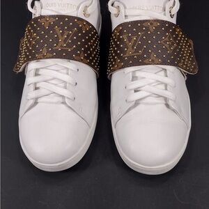 Louis Vuitton White Sneakers with Brown Strap size 8 pre owned Exellent Con