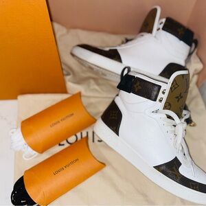 Stylish and comfortable, these Louis Vuitton women sneakers feature a chic white and brown design. Perfect for everyday wear, they offer both fashion and function.
