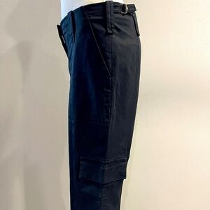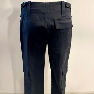 The pants feature 2 front pockets, zipper fly with hook closure, straps at the waist with silver monogrammed buckles, one single back flap pocket, and 2 side cargo packets on pant legs. Straight leg. Only worn a couple of times and dry cleaned, in excellent condition with no stains or flaws.