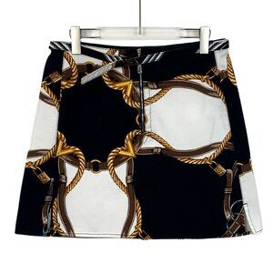 This Louis Vuitton A-line skirt features a striking rope and chain print in black, white, and gold tones. Crafted in Italy, it combines luxury and style with a tailored silhouette for a polished look.