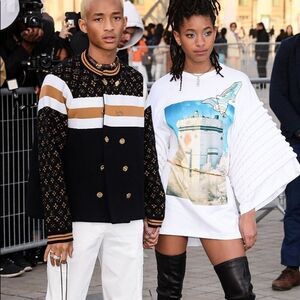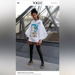 This white Louis Vuitton printed dress with oversized futuristic rope sleeves, captures the SS19 (Spring Summer 2019) collection’s statement silhouette. The large cotton jersey sleeves are reinforced with multiple rope inserts creating an Avant-garde futuristic look. On the front is a fantasy world LV Tower combined with an oversized Salt Lake “gel patch” like “what you would see in views of earth from space.” A brown monogram canvas tab decorates the collar as the perfect finishing touch.