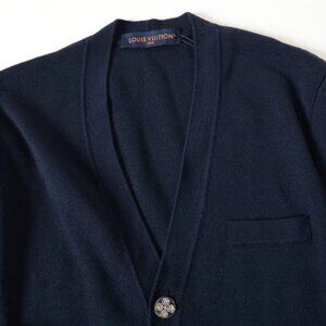The Louis Vuitton Wool Cardigan in navy blue is a refined and timeless wardrobe essential that showcases the brand’s signature elegance. Crafted from soft, high-quality wool, it offers both warmth and comfort with a polished finish. The front is detailed with six distinctive Louis Vuitton flower motif buttons, adding a subtle yet iconic touch to the classic design.