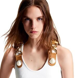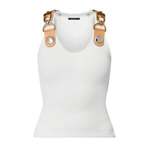 This tank top is elevated to statement status thanks to this season’s XXL metallic buckle details embellishing each of the shoulders for a contemporary utility look. The sleek, figure-skimming silhouette is cut from lightly textured, flexible viscose-blend jersey with a simple scoop neckline for versatile day-to-night styling options.