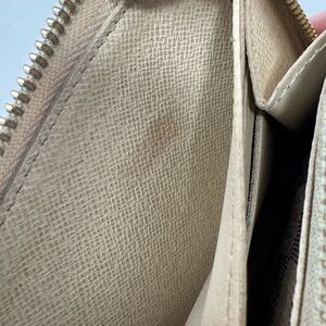 Louis Vuitton White Damier Azur Leather Long Zippy Wallet in good condition from 2017. The outside has light blue discoloration on the bottom of the wallet, and stains on the canvas. The interior presents a small light stain as shown in picture. Please look at all the pictures for exact condition as they are a part of the description.