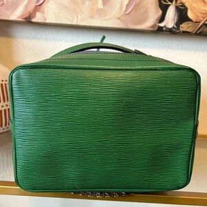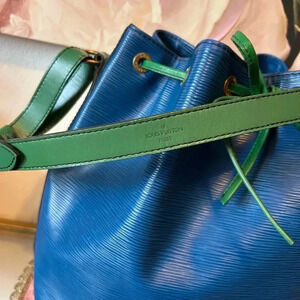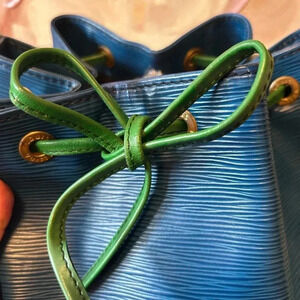 Fun vintage Louis bucket bag. Perfect pop of color for summer. Blue and green epi leather. This bag does show some wear. The corners have some rubbing. I had painted some of the green where it has color coming off, but with use it is coming off again. You can see it in the pics. The inside is very clean, the small zipper pocket has a mark on it from a tag or piece of paper that wore onto the fabric, itβs not sticky just a mark. The folds in the handles have some cracking paint, as well as the leather string that ties the bag shut. I have conditioned the bag to stop any further cracking. Please see all photos for condition, and ask all questions before purchasing.