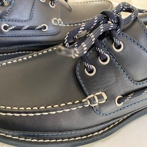 Louis Vuitton boat marine shoes, blue leather loafers with white stitching.